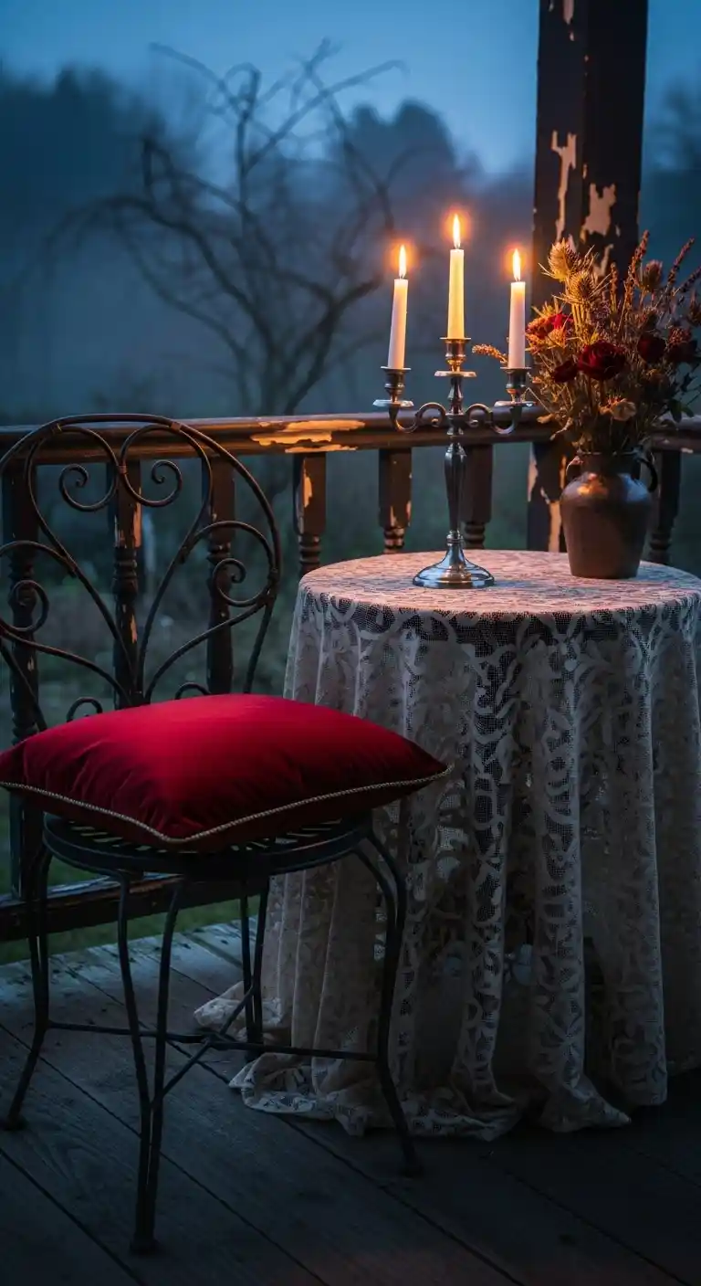 If you have porch seating, add velvet cushions in jewel tones — emerald, amethyst, or garnet — to introduce richness and comfort.
