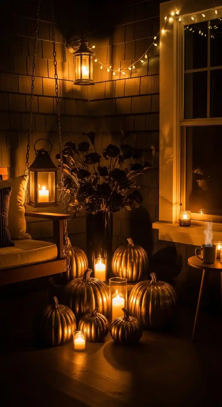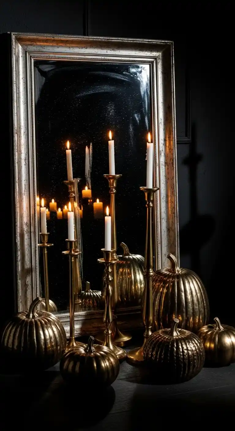 Think gilded candle holders, metallic pumpkins, and baroque picture frames displayed on side tables or steps.