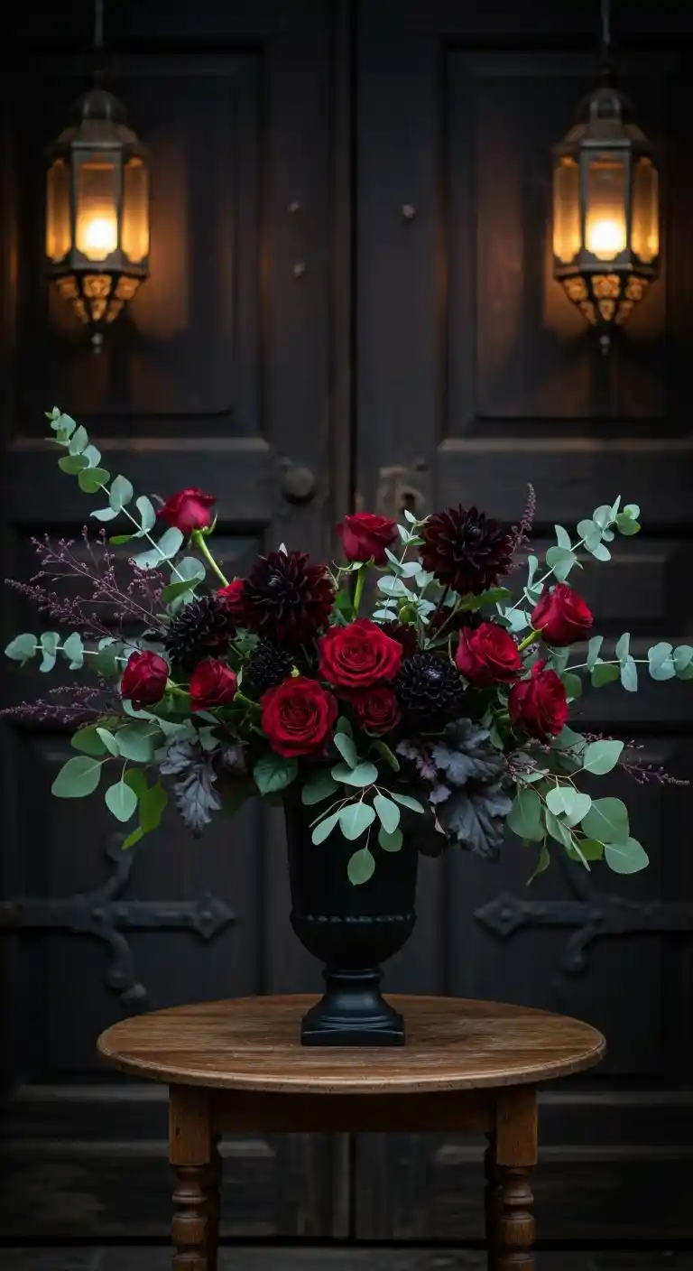Opt for deep-colored blooms like black dahlias, burgundy roses, dark calla lilies, and eucalyptus.