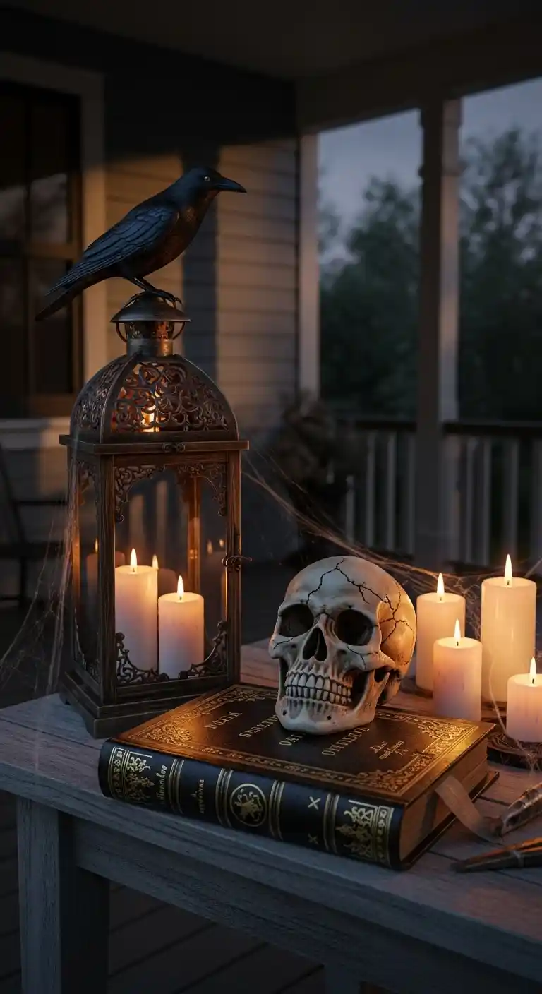 A black crow perched on a lantern or a porcelain skull beside a candle instantly adds intrigue.