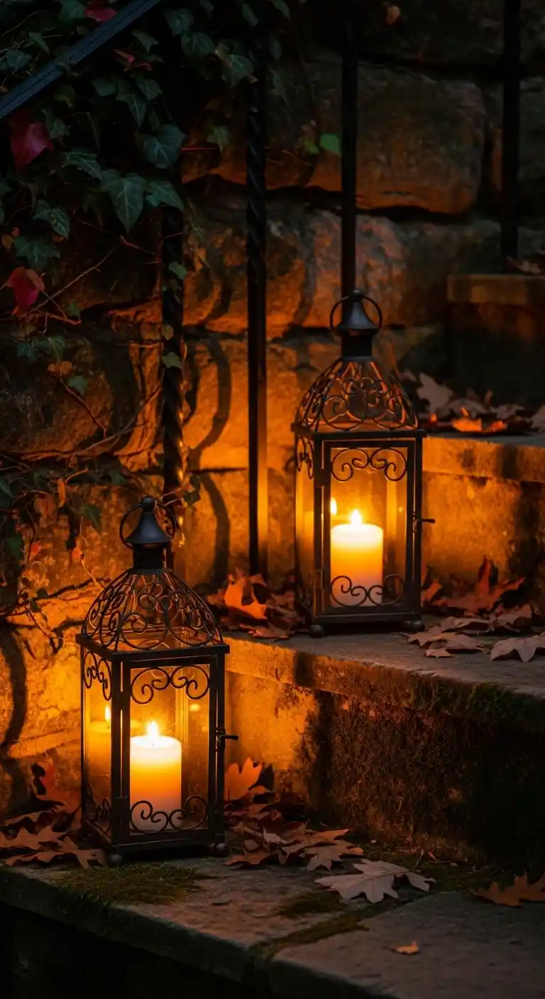 Mix lantern sizes for visual depth, arranging them near steps, beside planters, or hung from shepherd hooks.