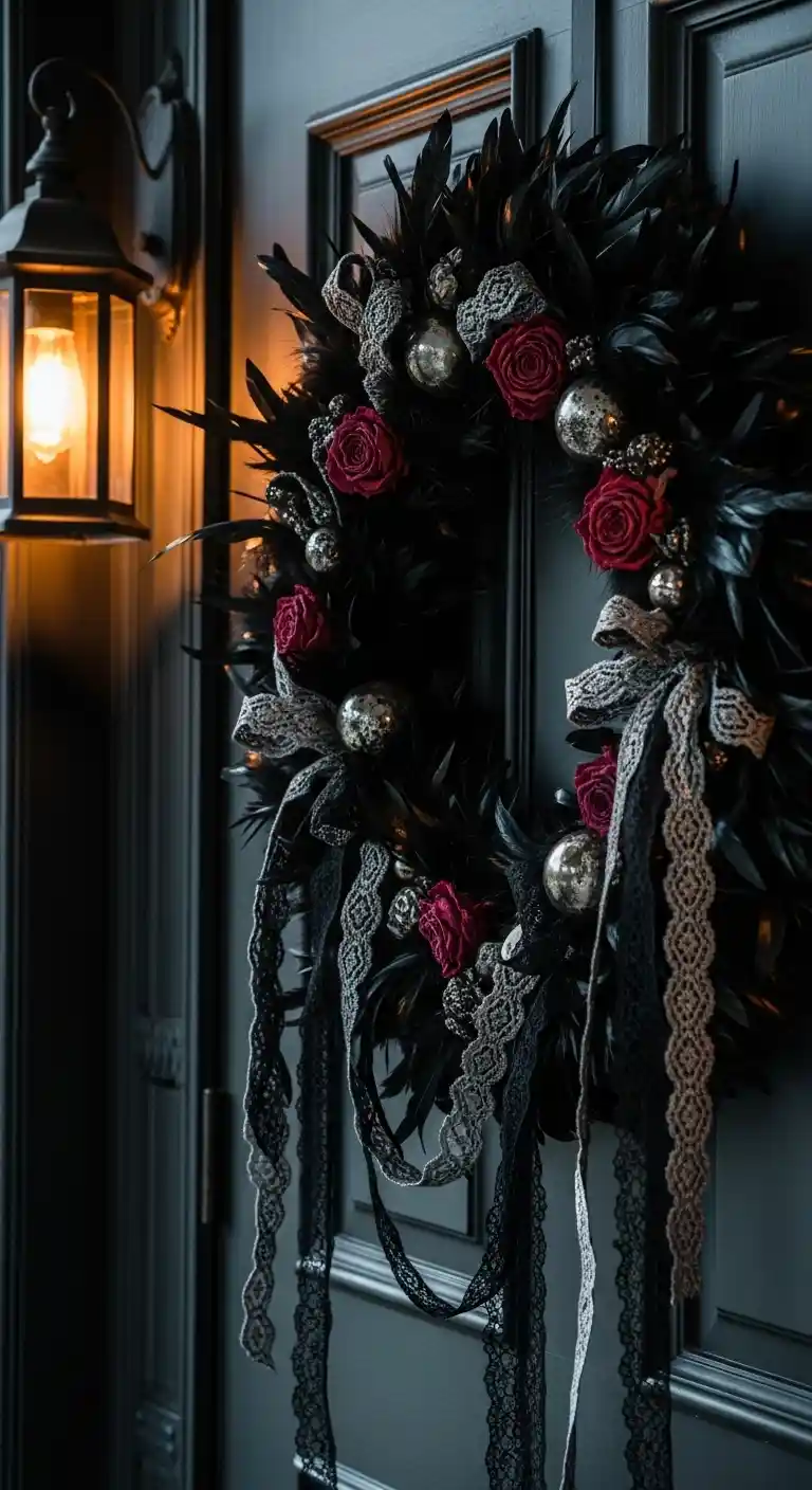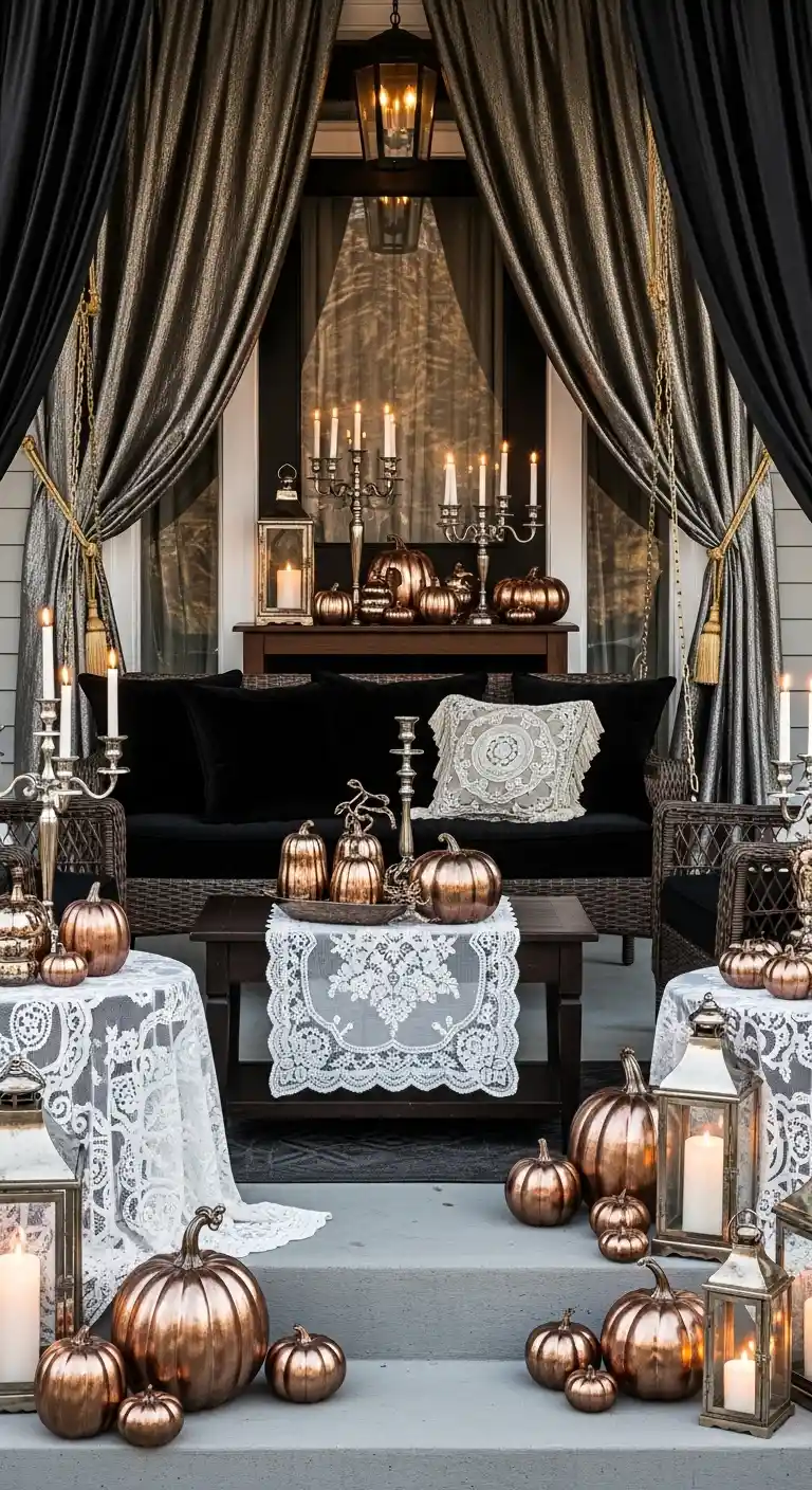 Skip traditional orange pumpkins — instead, opt for black feathers, dried roses, lace ribbons, and metallic embellishments.