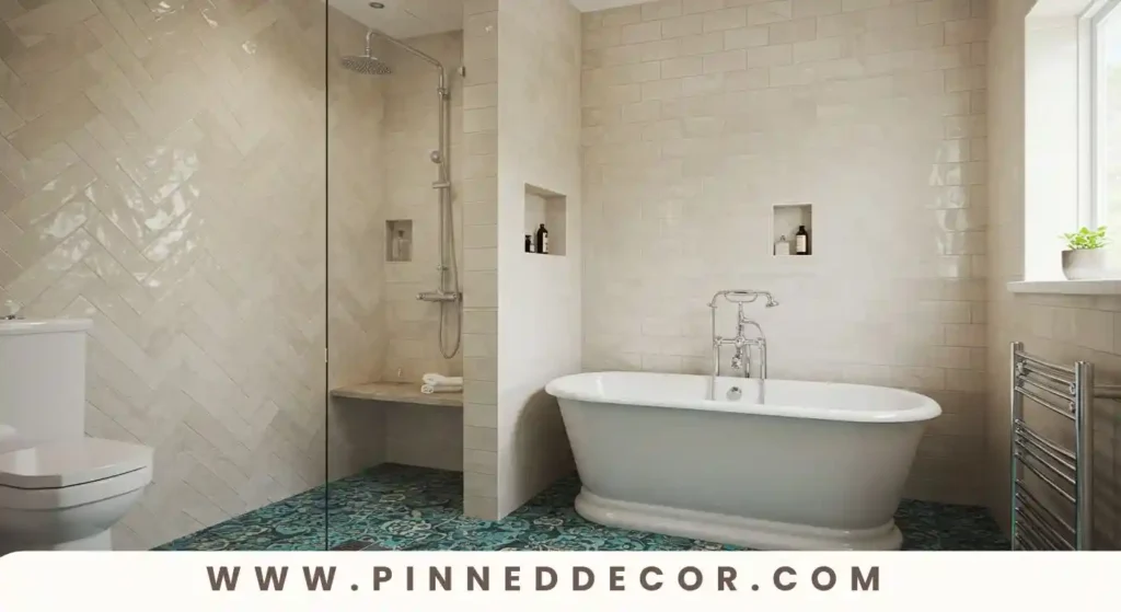 This bathroom tiles combination creates a high-end, artisanal look, perfect for master bathrooms.