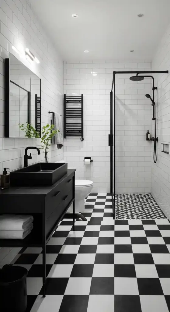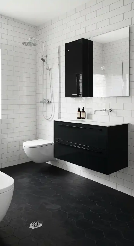 This bathroom tiles combination creates a crisp, modern aesthetic that feels timeless and bold, ideal for small bathrooms.