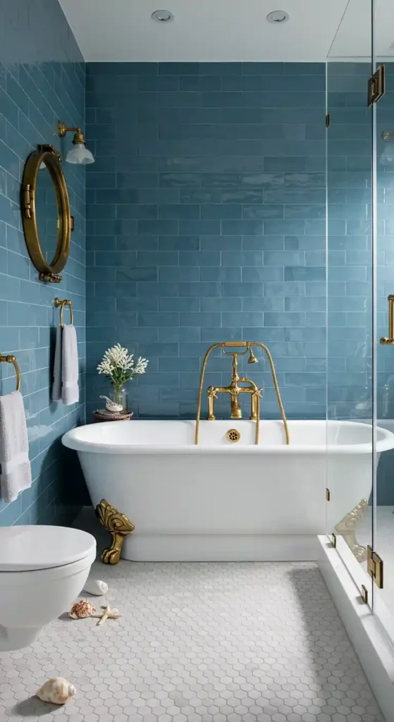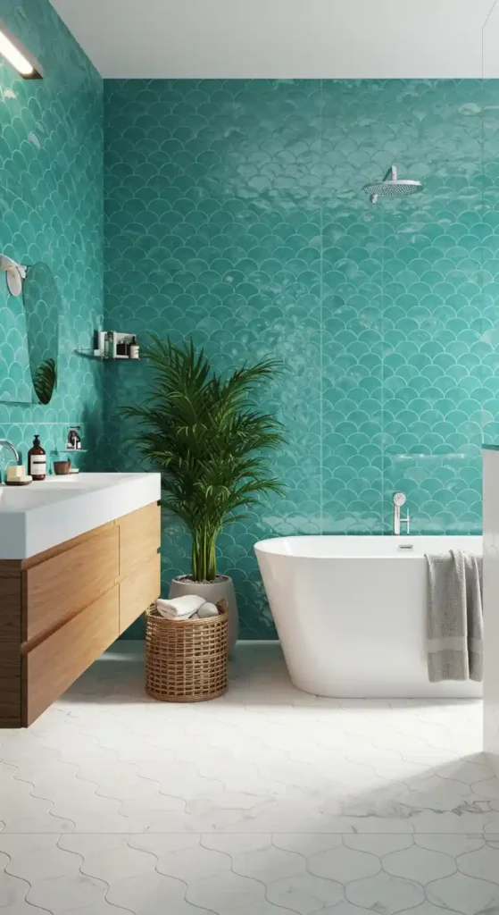 This bathroom tiles combination feels vibrant and coastal, creating a refreshing, vacation-inspired retreat.