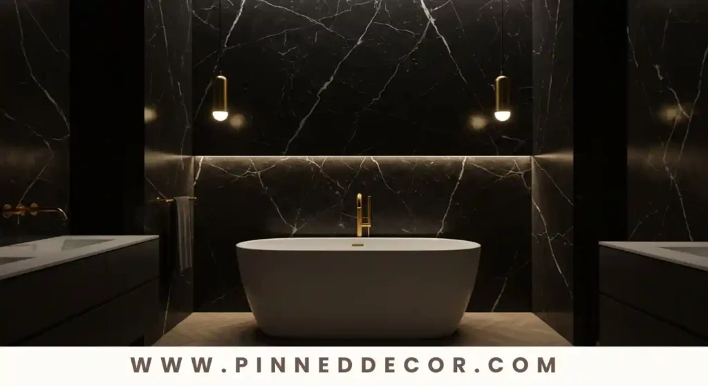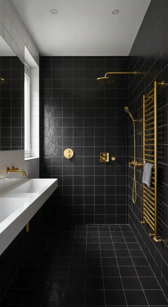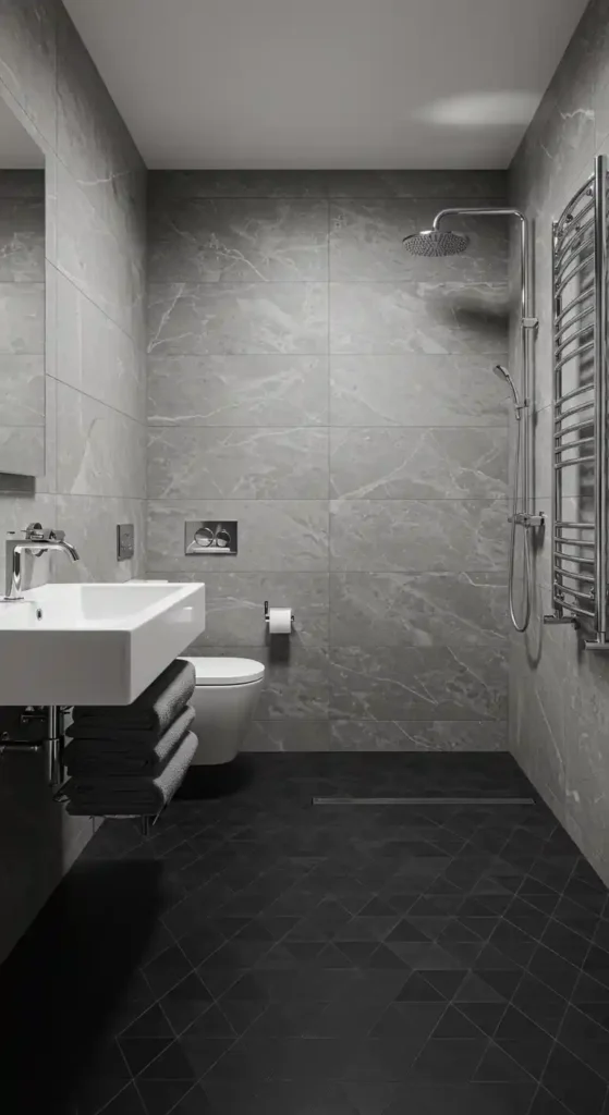 This bathroom tiles combination feels dramatic and elegant, ideal for upscale, modern bathrooms.