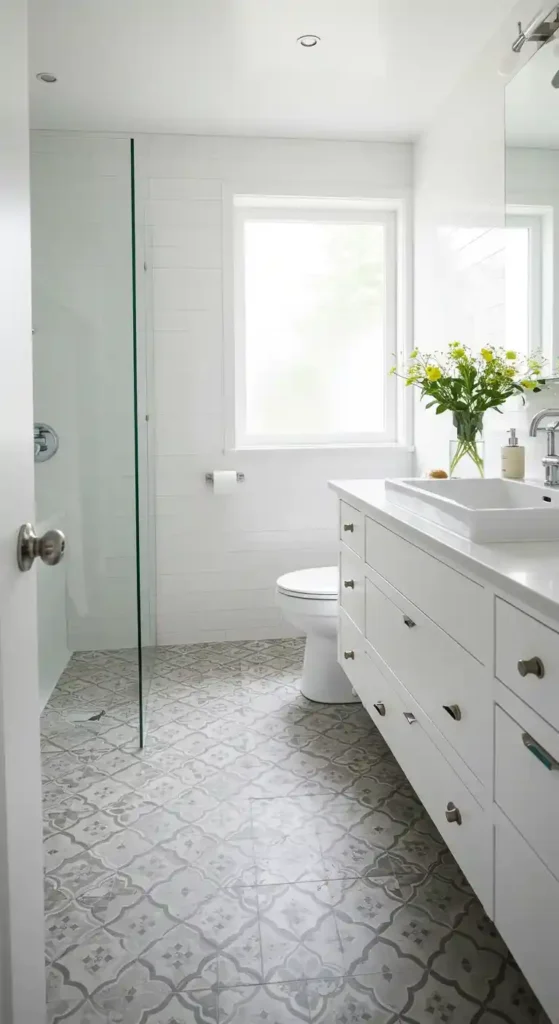 Encaustic tiles offer intricate designs that elevate the space without overwhelming the neutral walls.