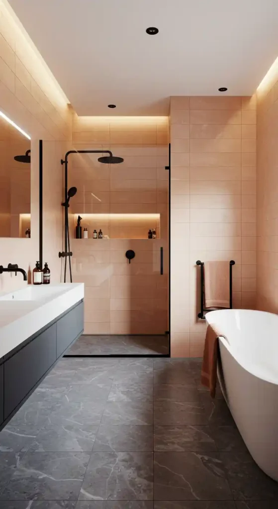This bathroom tiles combination blends modern boldness with natural warmth, ideal for contemporary bathrooms.