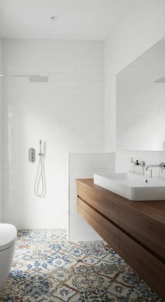 This bathroom tiles combination adds personality and warmth, ideal for eclectic or boho-inspired bathrooms.