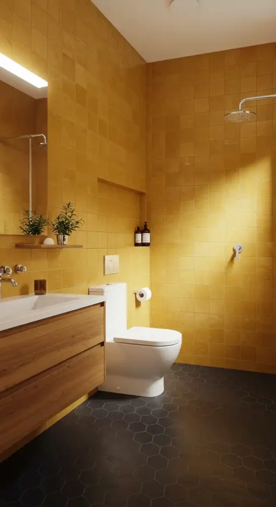 Pair mustard yellow wall tiles with black hexagon floor tiles for a bold bathroom tiles combination.
