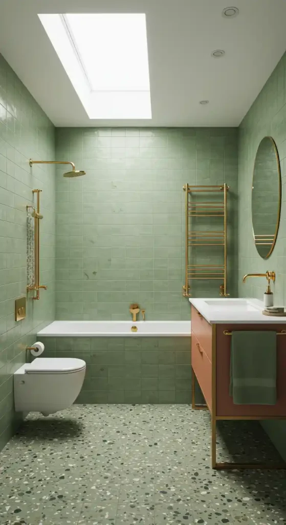 Combine sage green rectangular wall tiles with neutral terrazzo floor tiles for a soothing bathroom tiles combination.