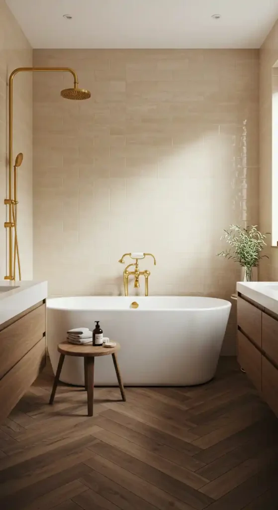 Combine beige ceramic wall tiles with a herringbone-patterned floor in neutral tones for an elegant bathroom tiles combination.