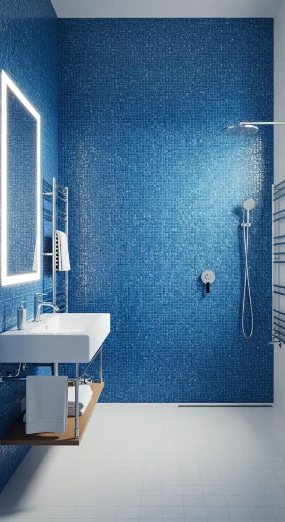 This bathroom tiles combination balances bold color with timeless marble, creating a sophisticated look for master bathrooms.