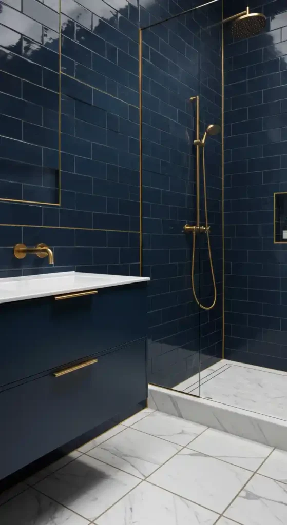 Incorporate brass grout lines or fixtures to add warmth and elegance.