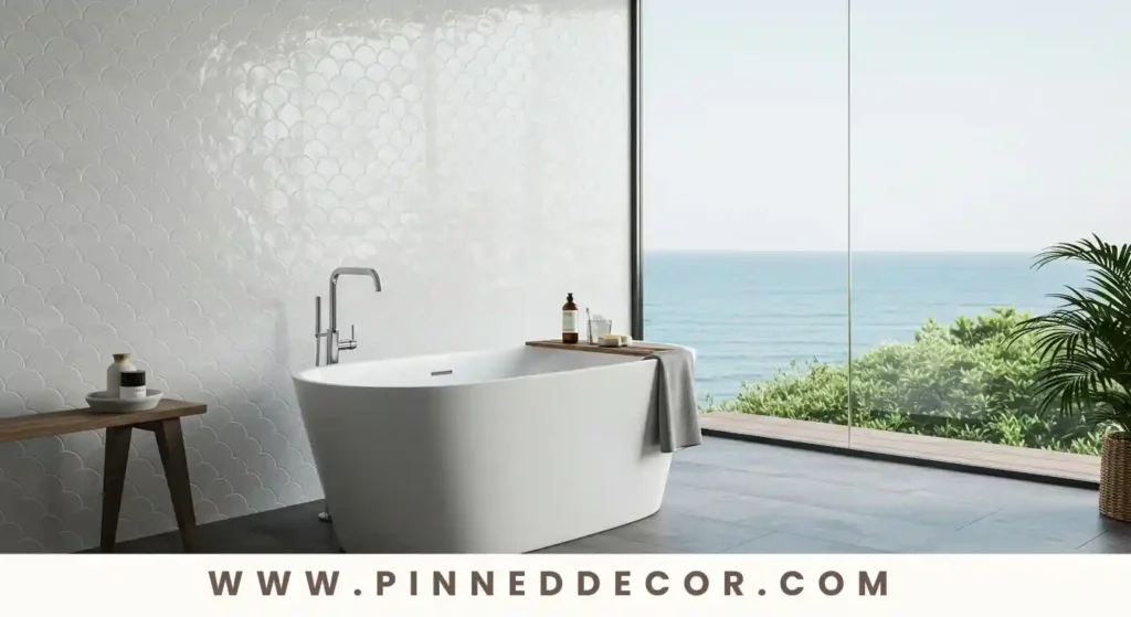 Fish scale tiles add dynamic texture, while white floors keep the space bright and open.