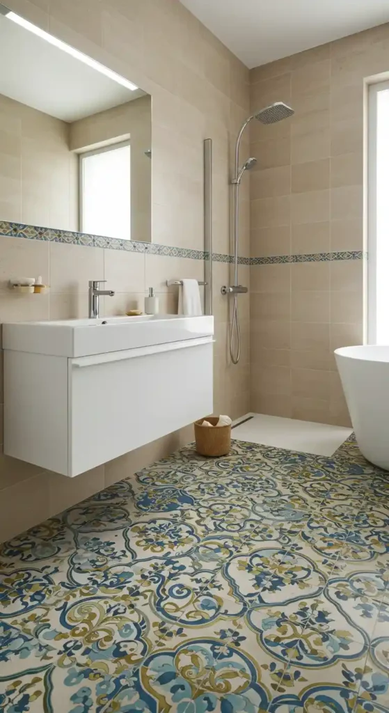 Pair vibrant encaustic floor tiles with neutral beige wall tiles for a dynamic bathroom tiles combination.