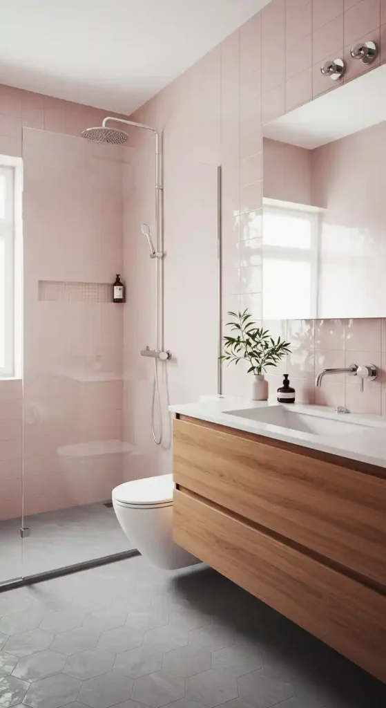 Use soft pink rectangular wall tiles with gray hexagon floor tiles for a gentle bathroom tiles combination.