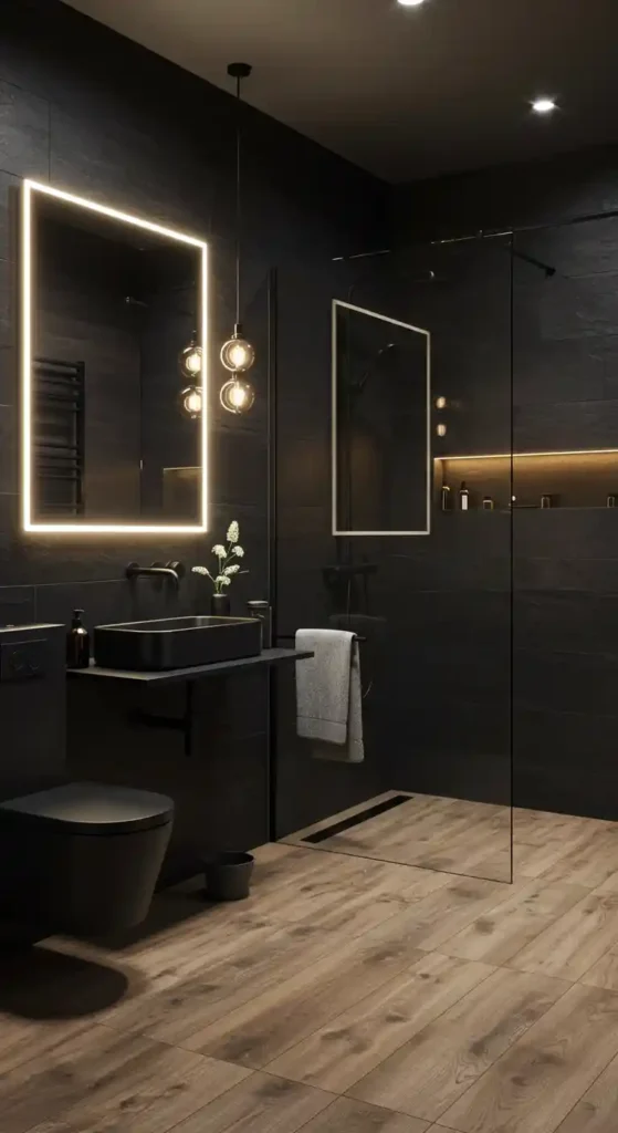 Wood-look tiles add a rustic touch to the dramatic black walls, balancing the design’s intensity.