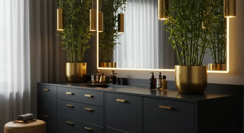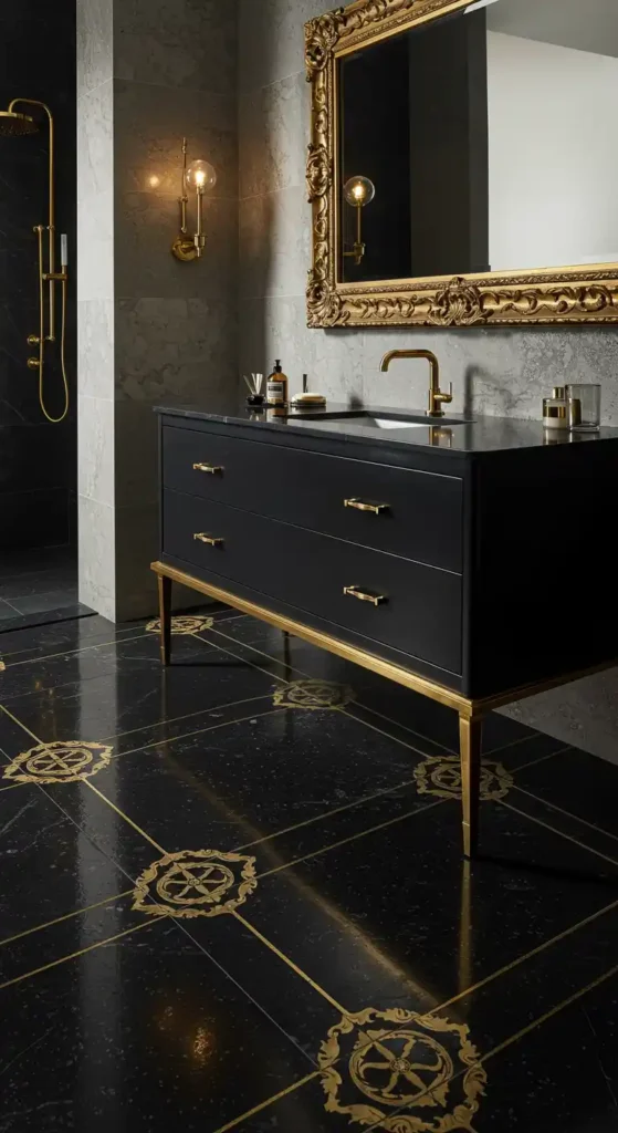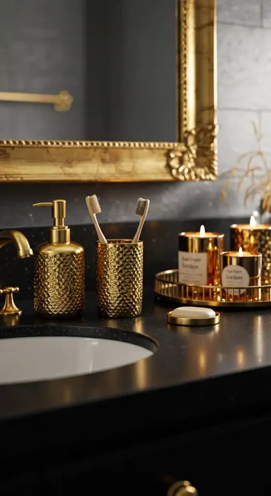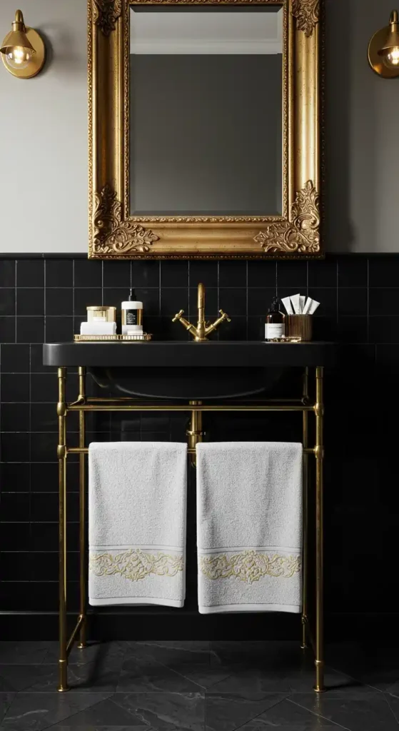 - Ideas: Combine black-and-gold mosaic tiles, a gold-framed vintage mirror, a black velvet stool, and a mix of matte and polished gold accessories.