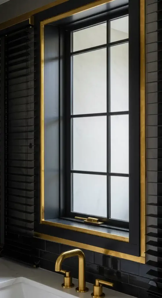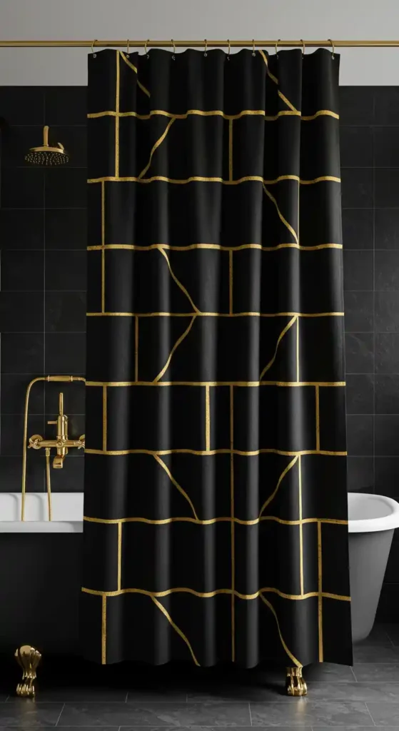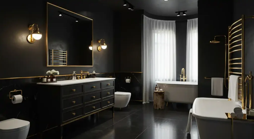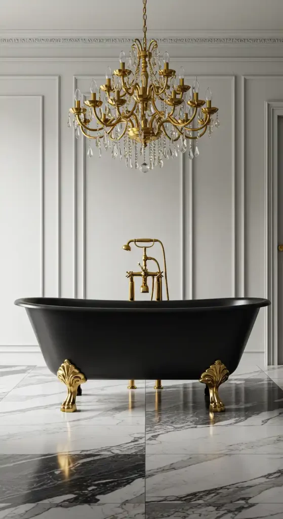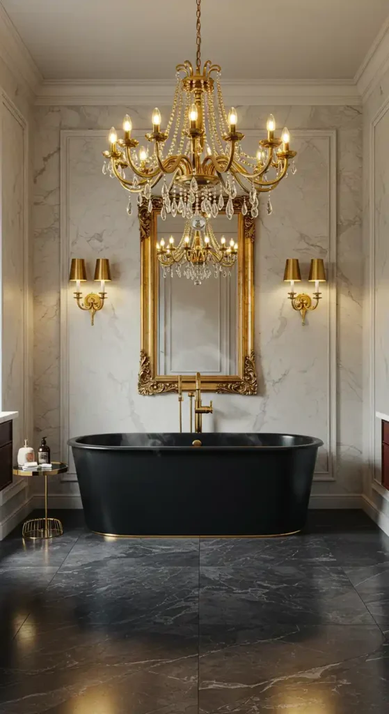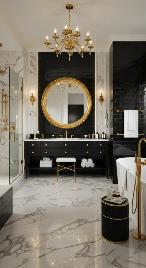 - Ideas: Incorporate black-and-gold wallpaper with fan or chevron patterns, a gold chandelier, a freestanding black tub with gold claw feet, and mirrored gold accents.