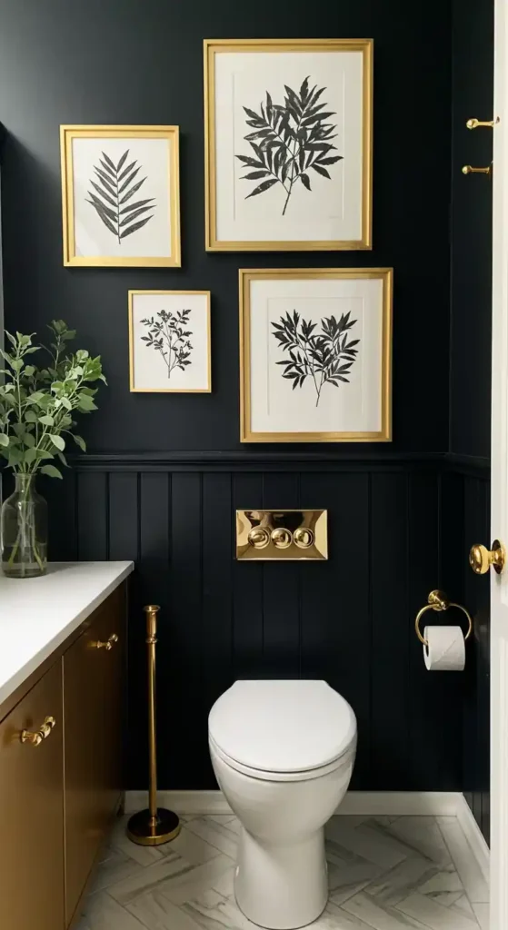 Paint one wall in matte black to create a dramatic backdrop, then enhance it with gold-framed mirrors, sconces, or artwork.