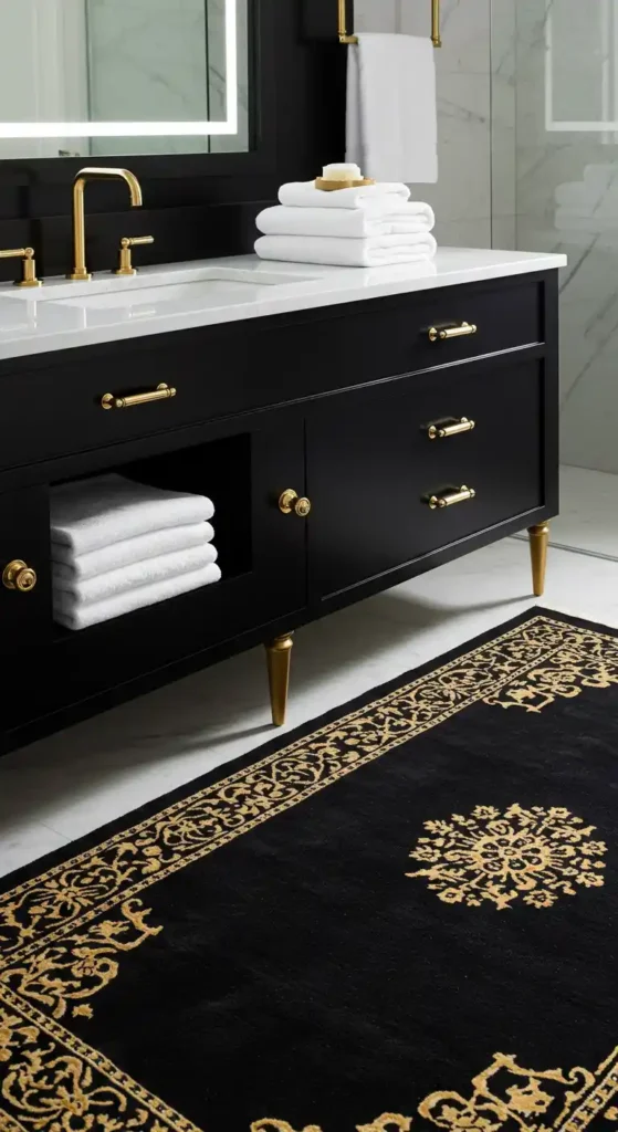 Add a black wool rug with gold patterns for cozy texture. For fall inspiration, check 10 Cozy Fall Bathroom Decor Ideas.