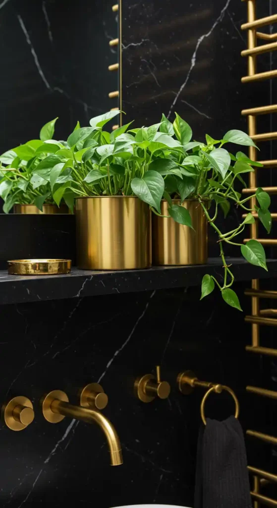 - Ideas: Incorporate black marble with gold veining, plush white towels, gold-accented plants, and a black bamboo ladder for towel storage.