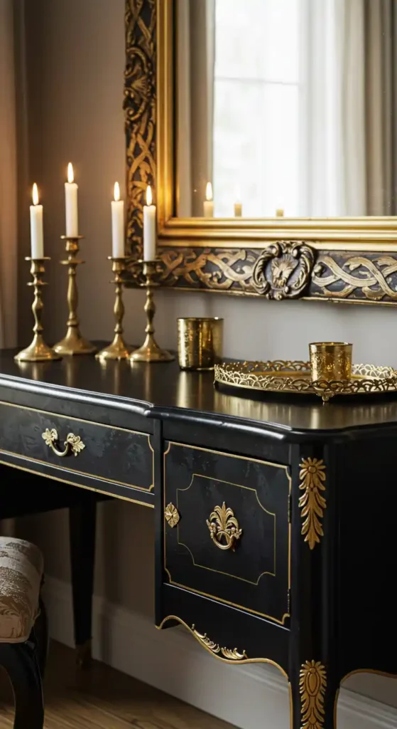 Customization: For a bespoke look, consider a custom vanity with gold inlays or trim, or repurpose a vintage piece by painting it black and adding gold hardware.