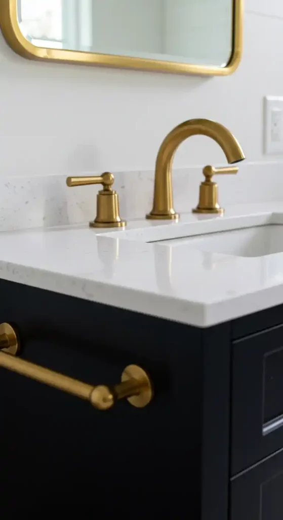 Pro Tip: Ensure all gold fixtures share the same finish. For more on fixtures, see 8 Stylish Bathroom Hardware Trends.
