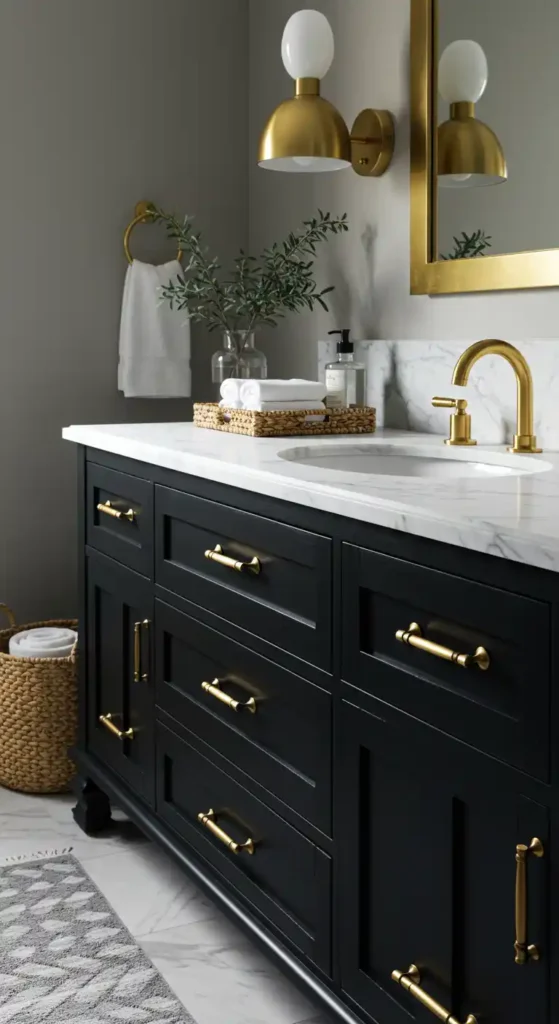 A black vanity with gold knobs, pulls, or handles serves as a chic centerpiece that anchors the bathroom.