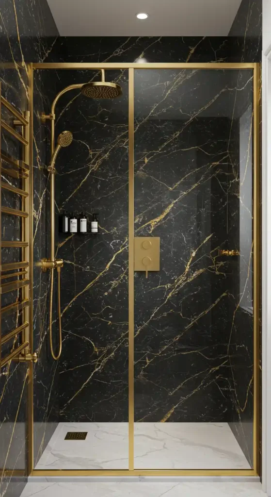Black marble with subtle gold veining is a luxurious material that adds natural elegance to countertops, shower walls, floors, or even a bathtub surround.