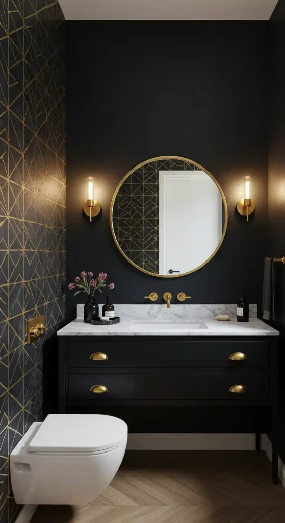 Wallpaper is an excellent way to introduce pattern, texture, and personality to a black and gold bathroom.