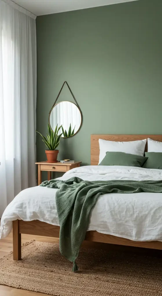Sage green’s calming, nature-inspired hue pairs with crisp white for a fresh, airy bedroom, ideal for minimalist or Scandinavian styles.
