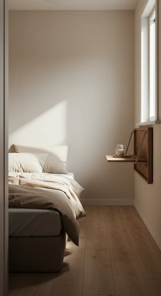 Install a foldable bedside table on the wall to hold essentials like a phone or book, folding it down when not in use.