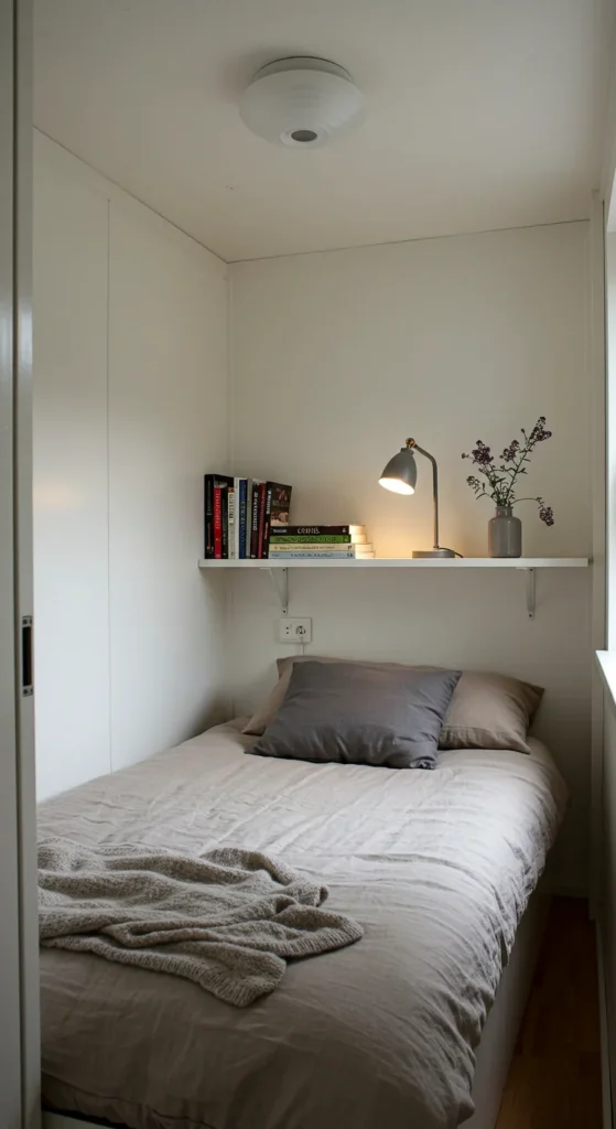 This tiny bedroom idea keeps essentials like books or a phone within reach without cluttering the floor.