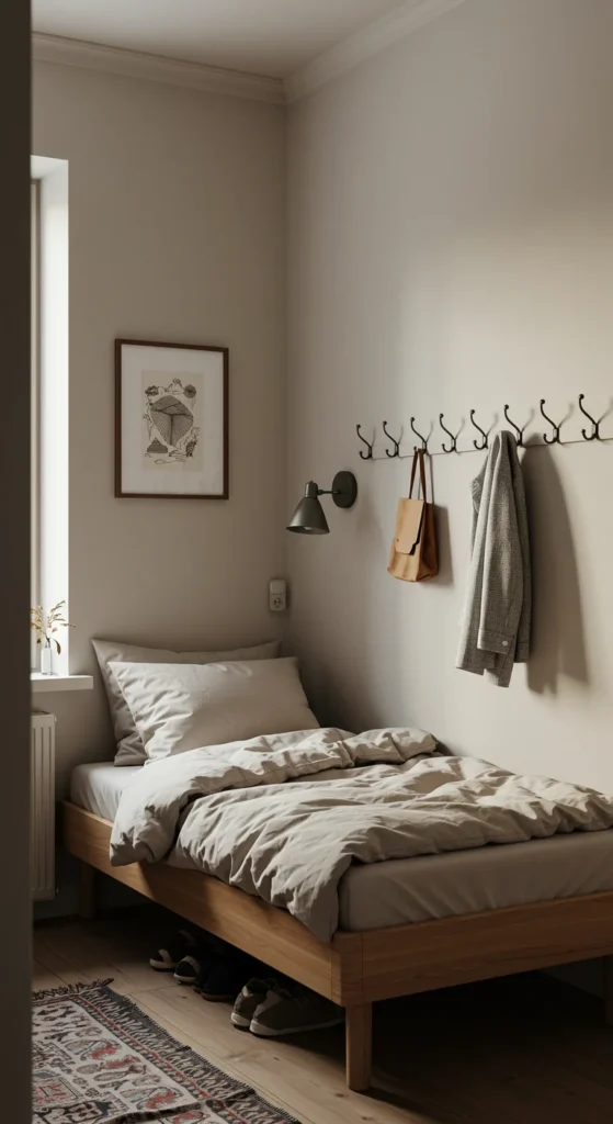 This tiny bedroom idea keeps items off the floor while adding a functional, aesthetic touch.