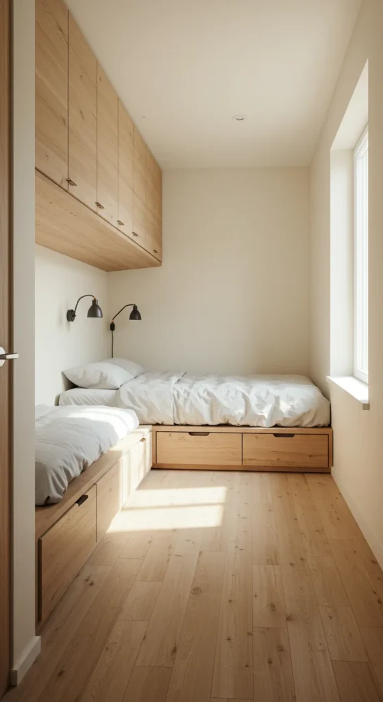 This tiny bedroom idea leverages vertical space, keeping the floor clear for movement or furniture.