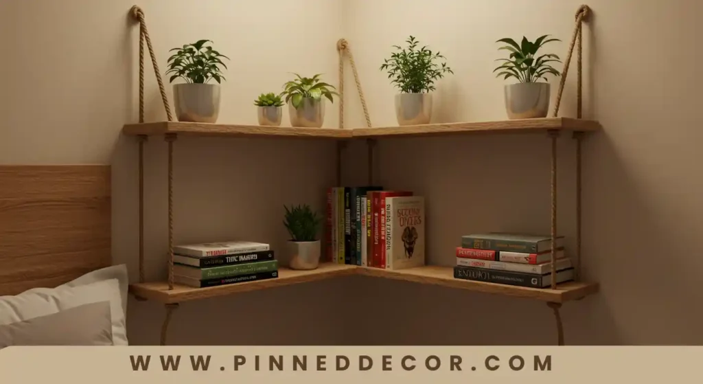 Install hanging rope shelves in a corner for lightweight storage of books, plants, or decor.