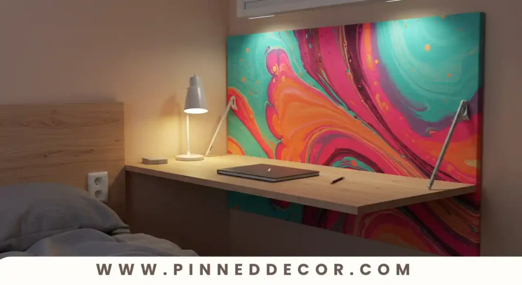 Mount a fold-down desk disguised as wall art, doubling as a workspace and decorative piece.