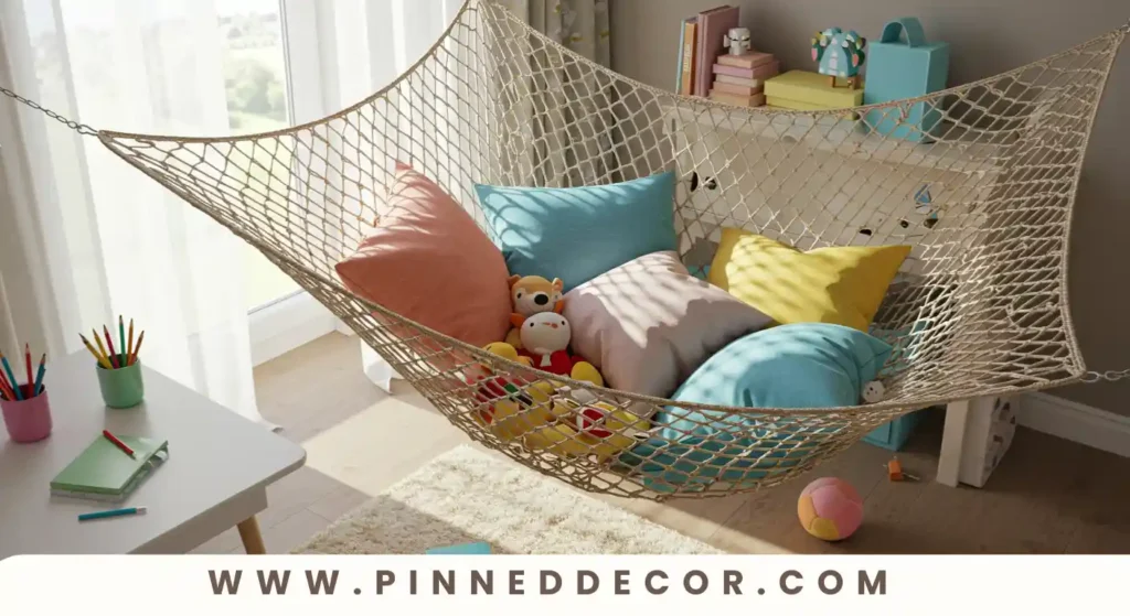 Install a ceiling-mounted storage net above the bed or in a corner for lightweight items like pillows or stuffed toys.