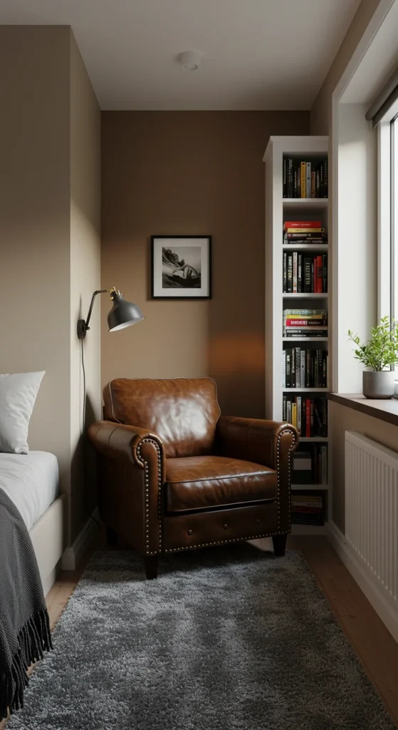 Create a cozy reading nook in a bedroom corner with a compact chair and a small wall-mounted shelf.