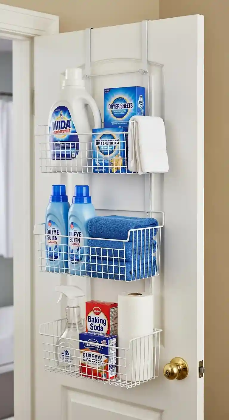 Add an over-the-door organizer with wire baskets or hanging shelves.