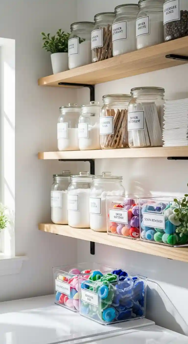 Transfer detergents, scent boosters, and dryer sheets into clear jars or acrylic bins.
