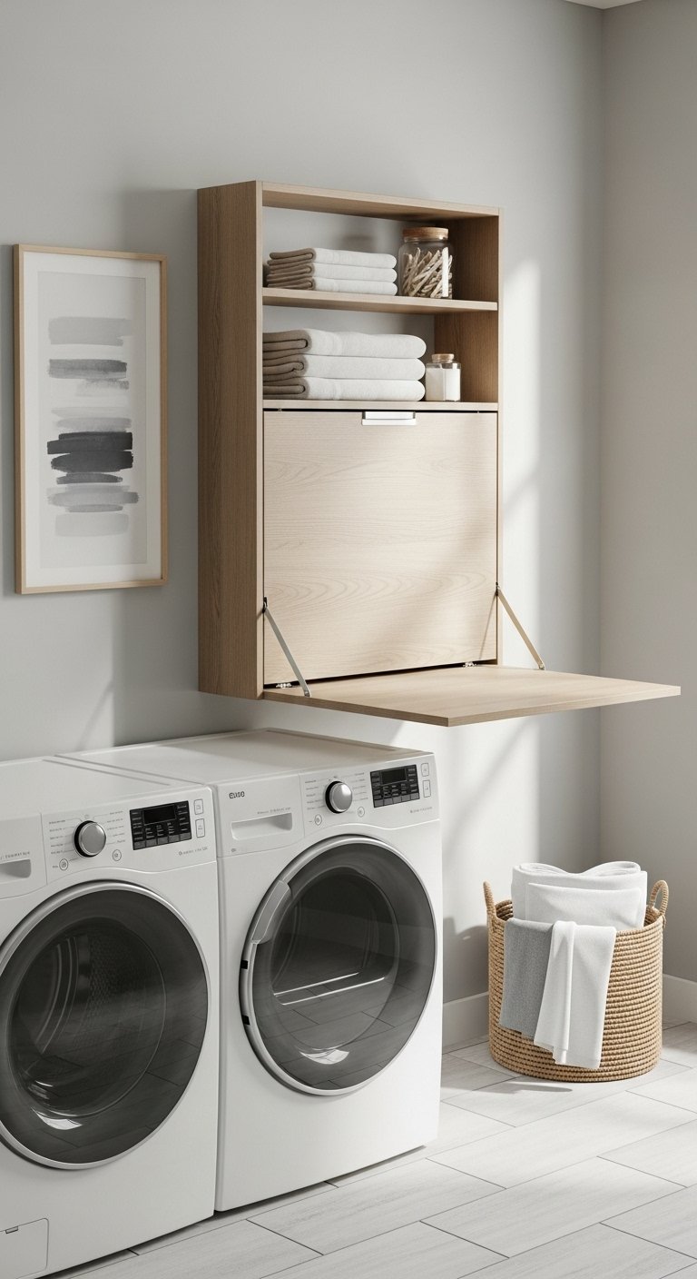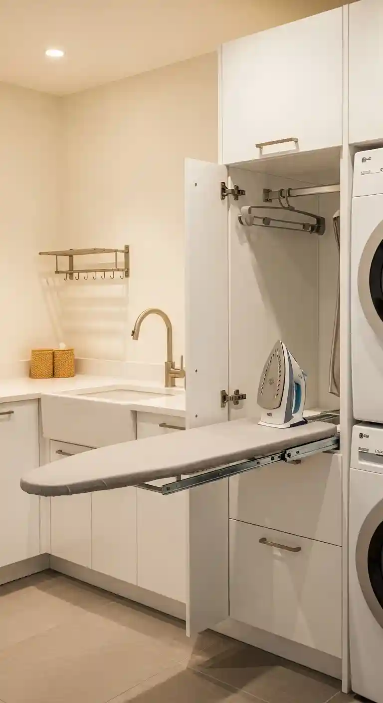 A fold-out or pull-down ironing board saves space while keeping the room functional.