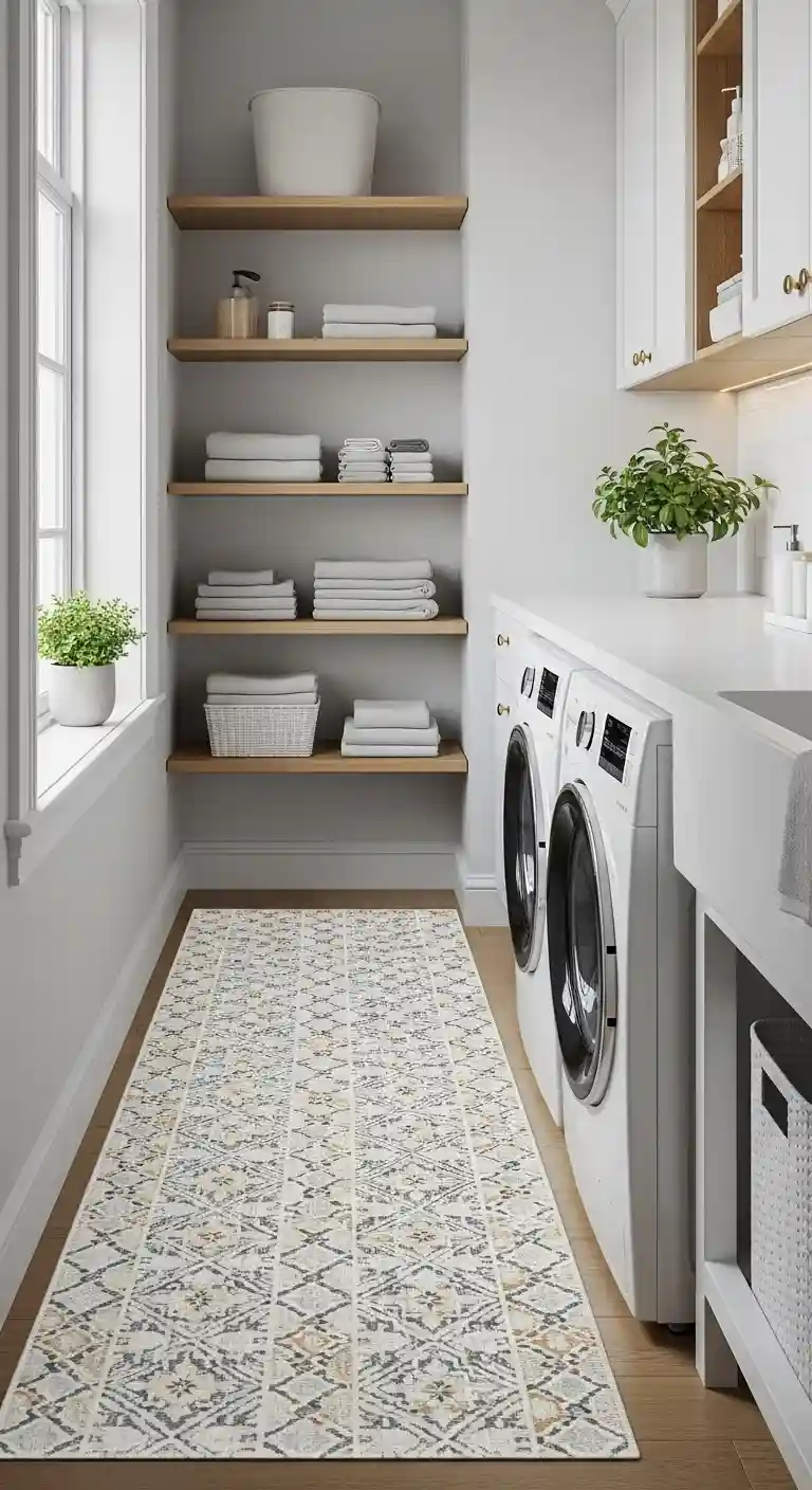 A soft rug or runner adds comfort and warmth to a small laundry area.