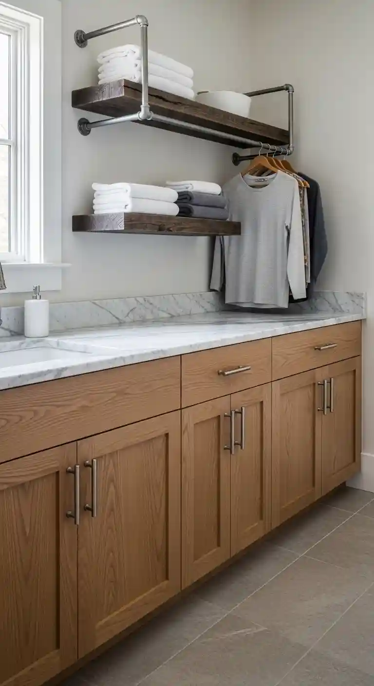 Floating shelves bring functionality and style to narrow laundry rooms.
