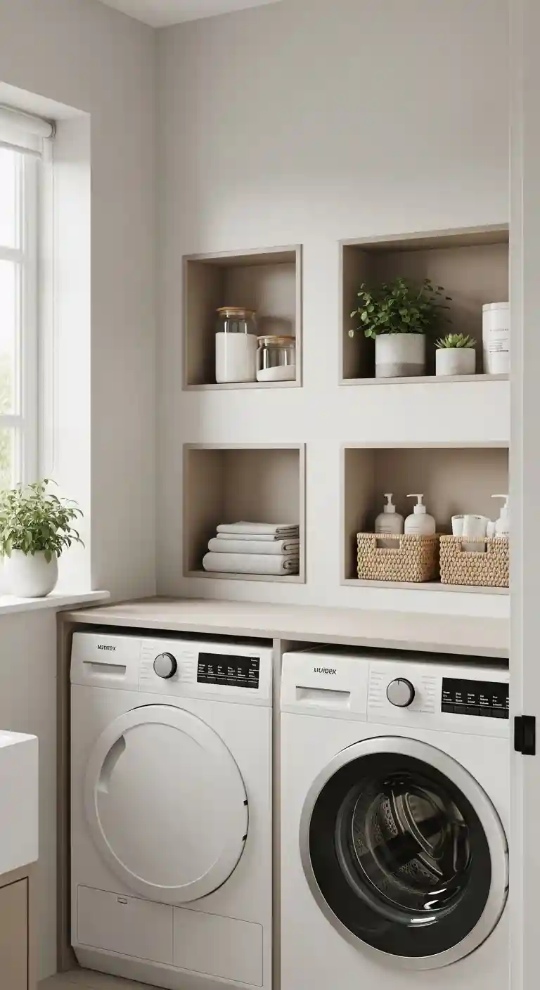 Consider integrating built-in shelving or a tall cabinet adjacent to the stacked units for detergents, cleaning tools, and linens.