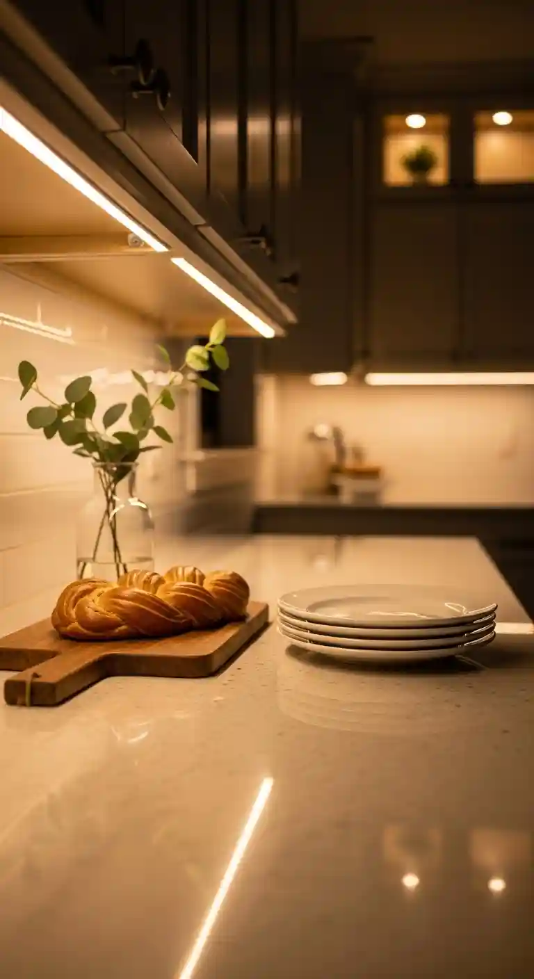 LED strip lights or puck lights installed beneath shelves provide both function and ambiance.
