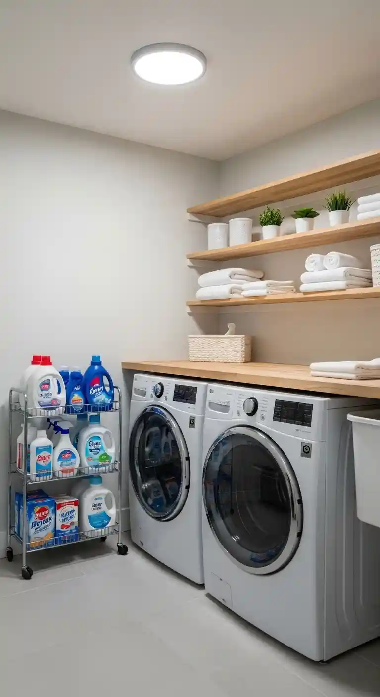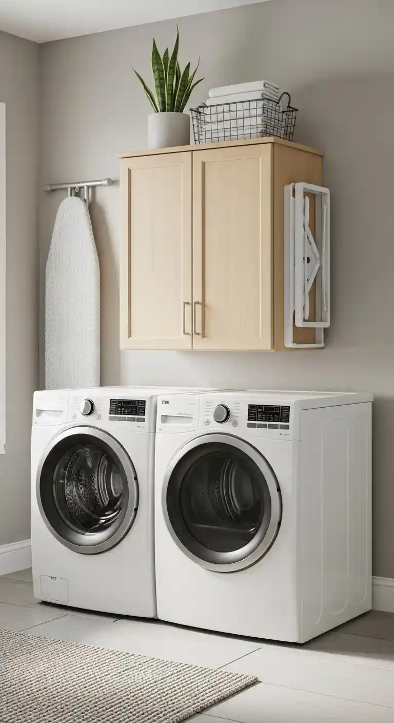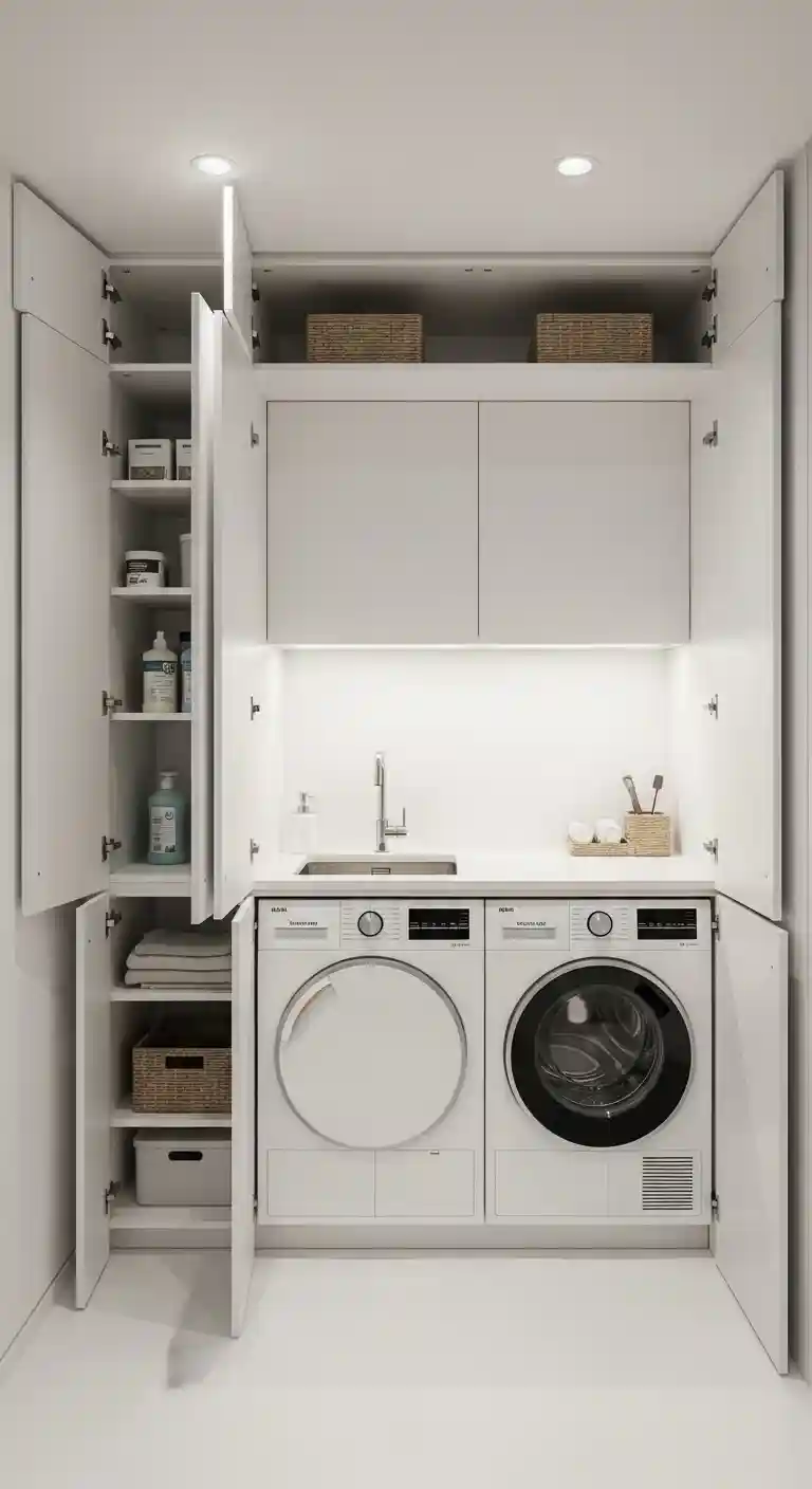 Tall cabinets can store detergent, baskets, or cleaning tools neatly out of sight.
