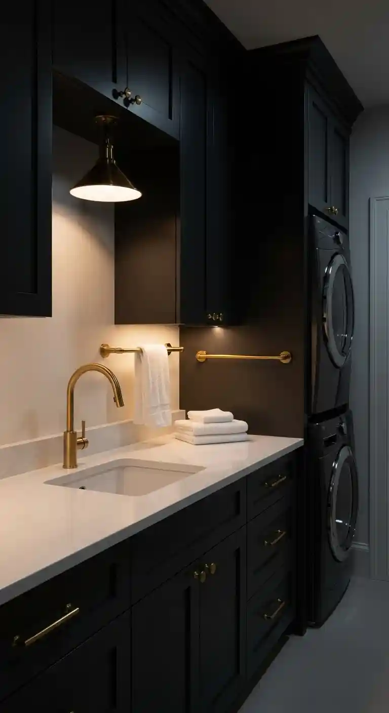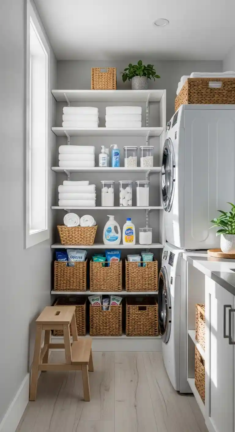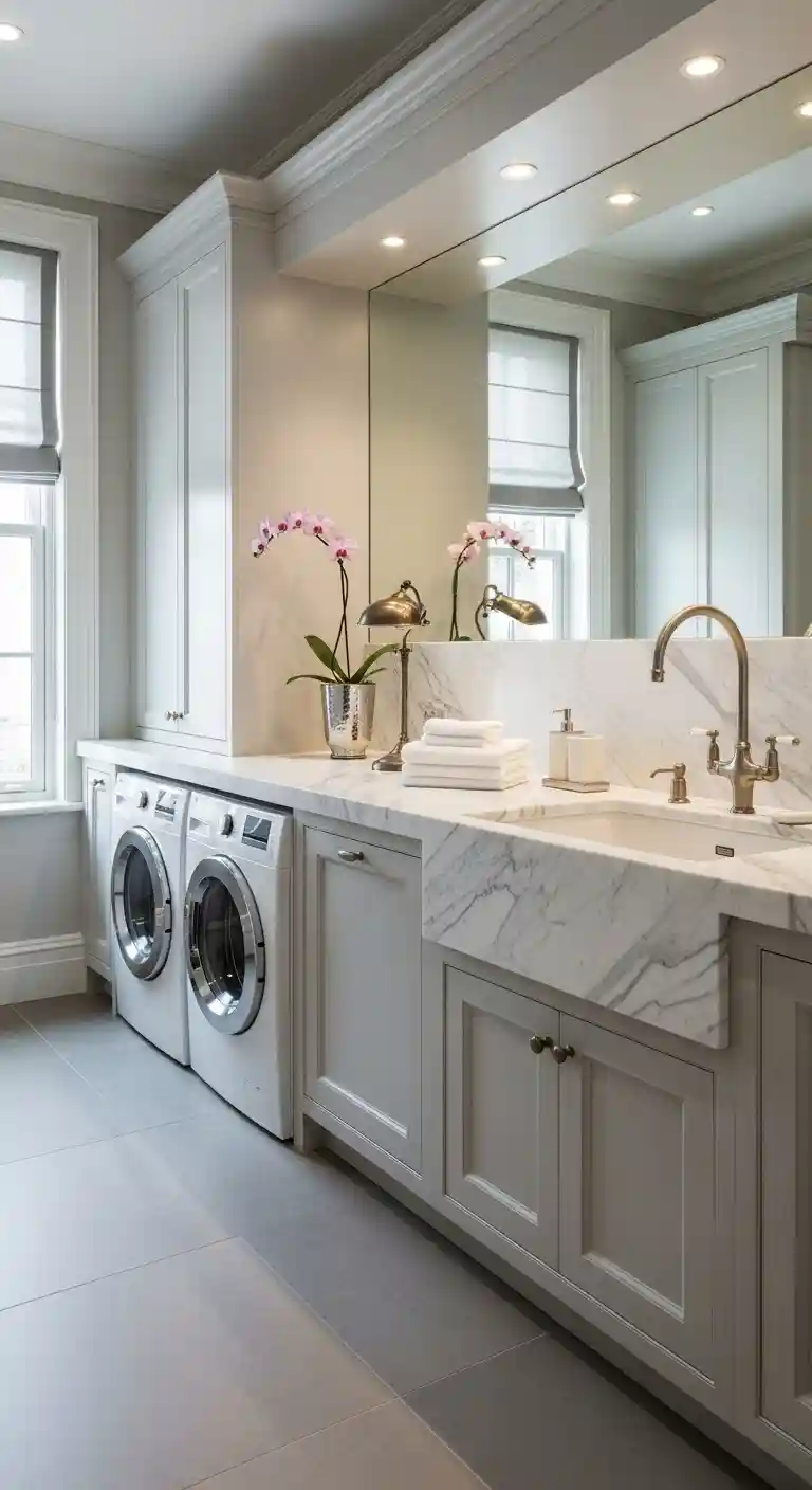 This creates a luxurious, hotel-inspired laundry aesthetic.